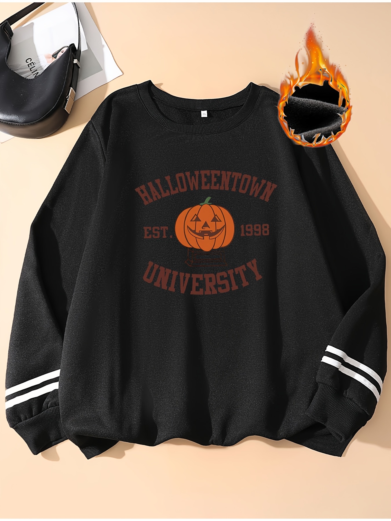 Plus Size - Halloween 2024 Women'S Plus Size Long Sleeve Crewneck Sweatshirt - "Halloween Town" Print, Black with Orange & White Stripes, Casual Fall/Winter Wear, 1-8x I (Ideal for Thanksgiving)