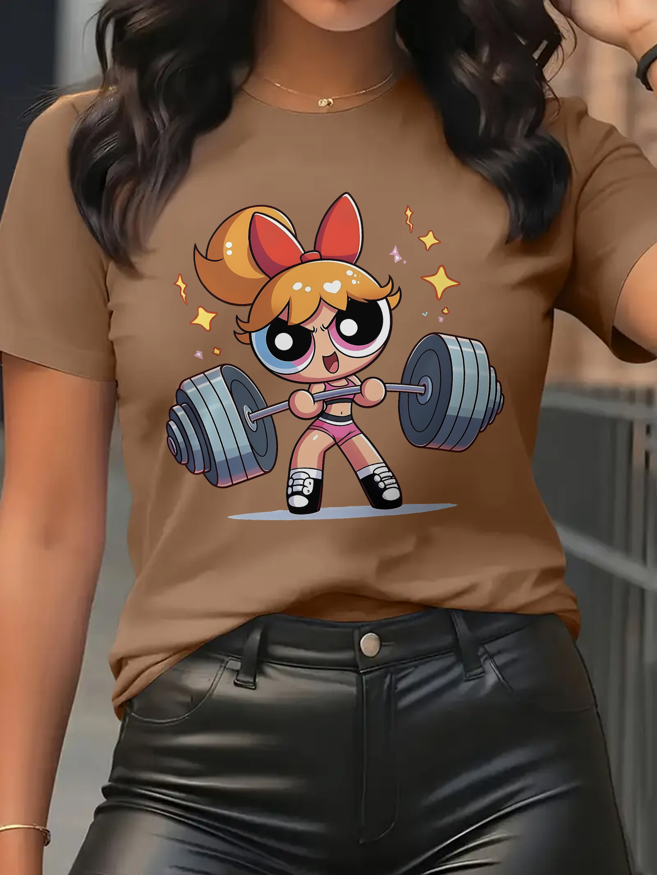 Women'S Y2K-Inspired Casual T-Shirt with Cartoon Print - Short Sleeve, Round Neck, All-Season Top | Playful Anime-Style Design with Bow and Weightlifting