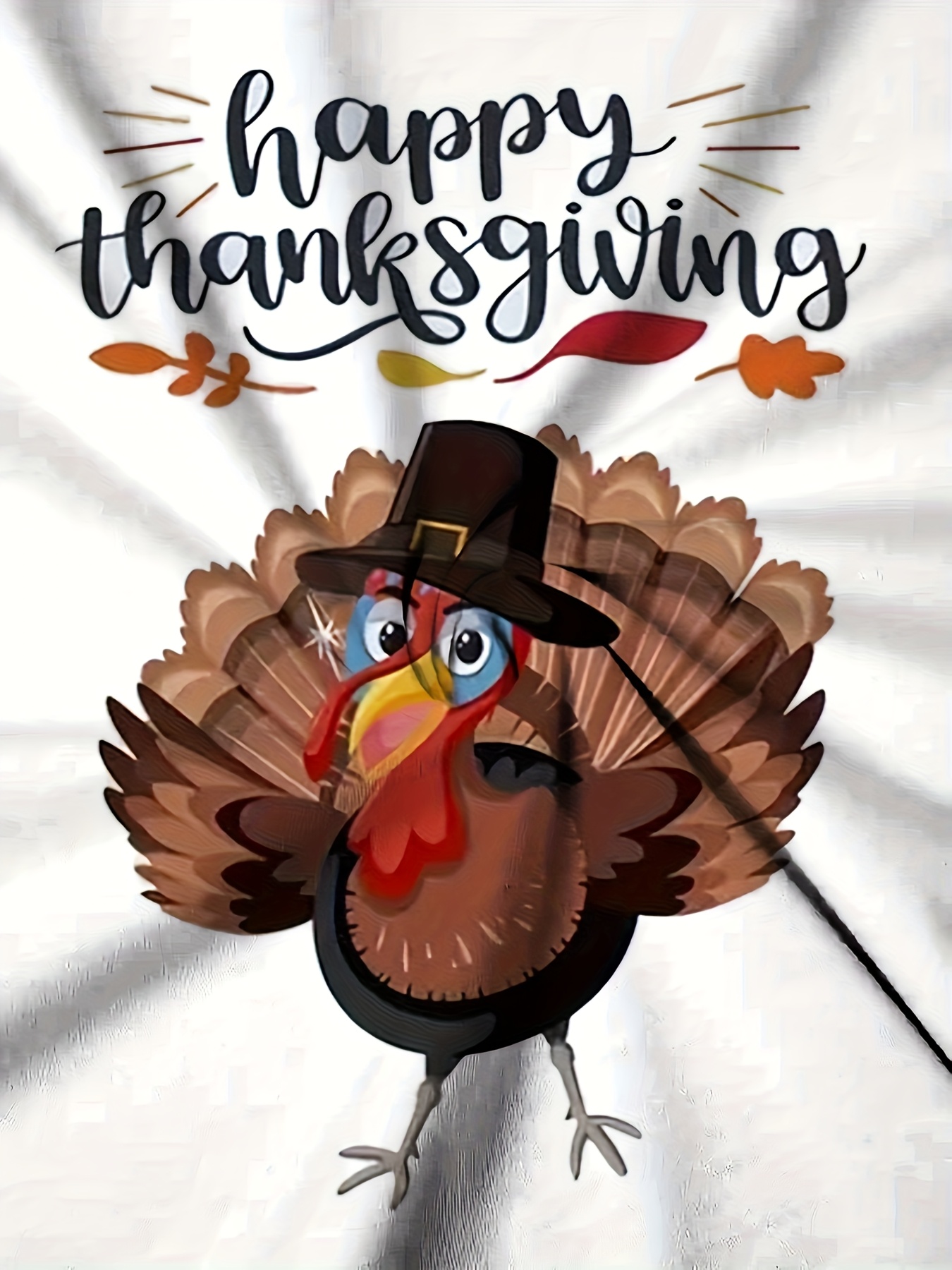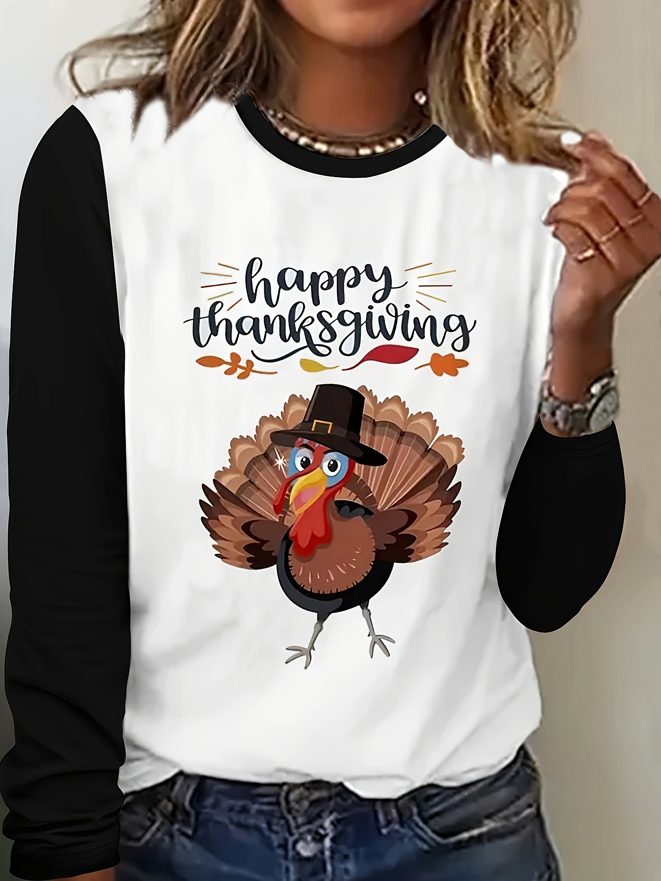 Plus Size, Women's Thanksgiving Turkey Graphic Long Sleeve T-Shirt - Happy Thanksgiving Top with Fall Leaves, White Shirt for Holiday Parties & Everyday Fall Outfits - Machine Washable Casual Women's Apparel