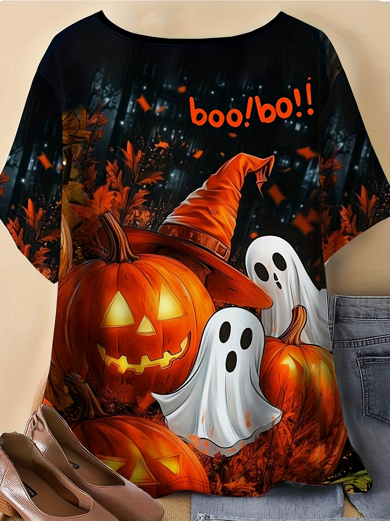 [Women's Halloween T-Shirt] Plus Size - Women's 3D Print Halloween T-Shirt - Spooky Witch & Pumpkin Design, Breathable Short Sleeve Crew Neck, Machine Washable, Soft Fabric, Perfect for Fall & Halloween Celebrations, Halloween Shirts
