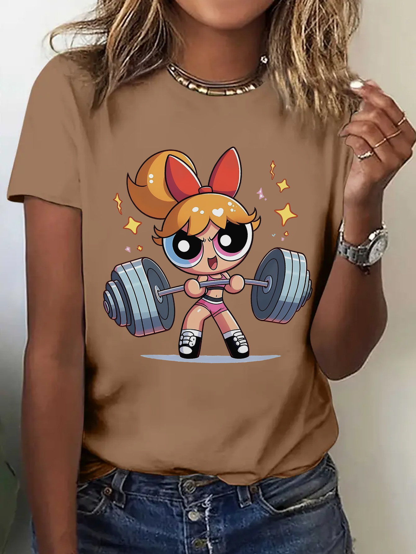 Women'S Y2K-Inspired Casual T-Shirt with Cartoon Print - Short Sleeve, Round Neck, All-Season Top | Playful Anime-Style Design with Bow and Weightlifting