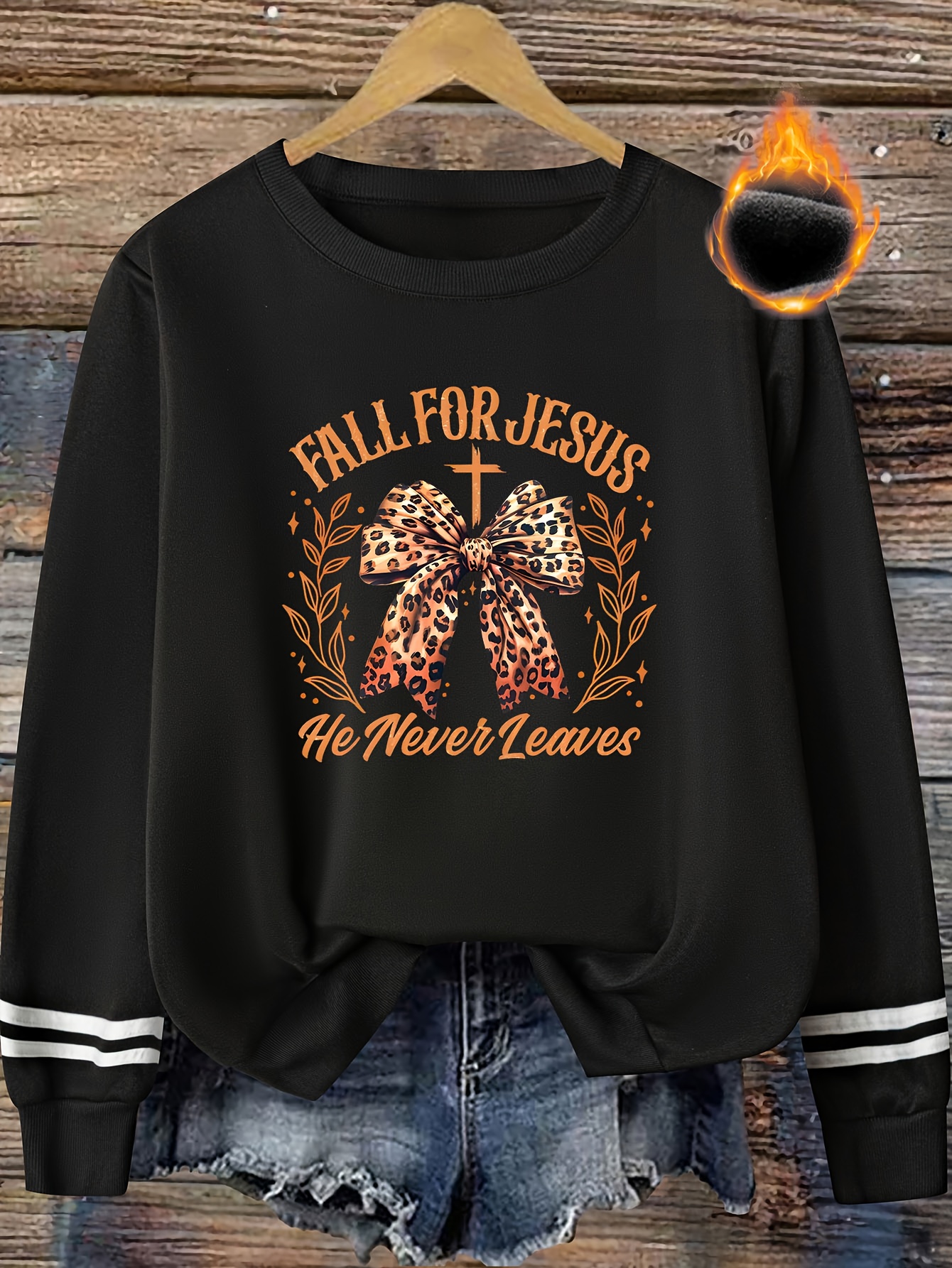 Plus Size, Women's Plus Size Long Sleeve Sweatshirt - Religious Christmas Graphic "Fall for Jesus He Never Leaves" - Black with Orange Lettering - Casual Pullover Top for Church, Everyday Winter Wear - Machine Washable