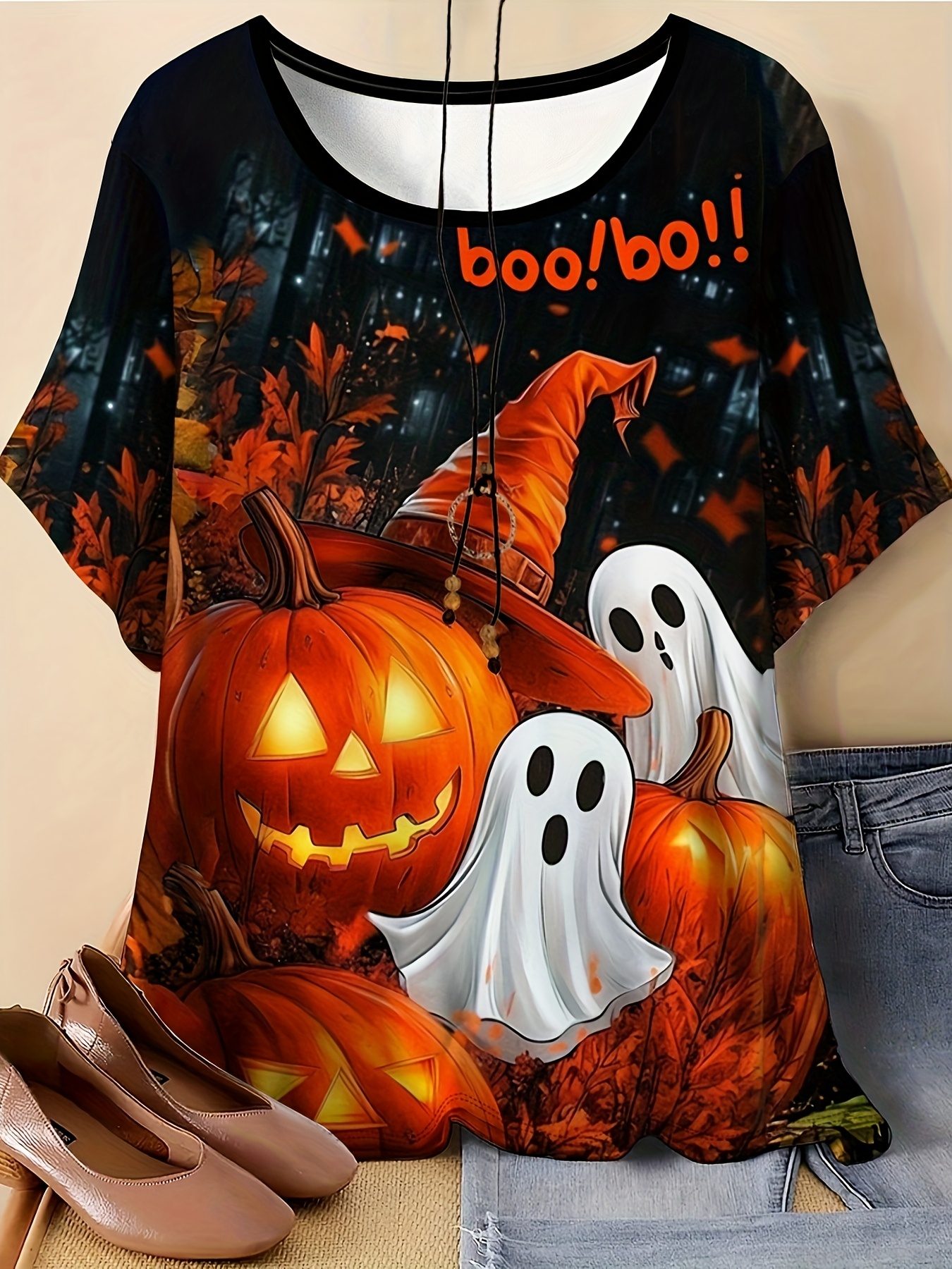 [Women's Halloween T-Shirt] Plus Size - Women's 3D Print Halloween T-Shirt - Spooky Witch & Pumpkin Design, Breathable Short Sleeve Crew Neck, Machine Washable, Soft Fabric, Perfect for Fall & Halloween Celebrations, Halloween Shirts