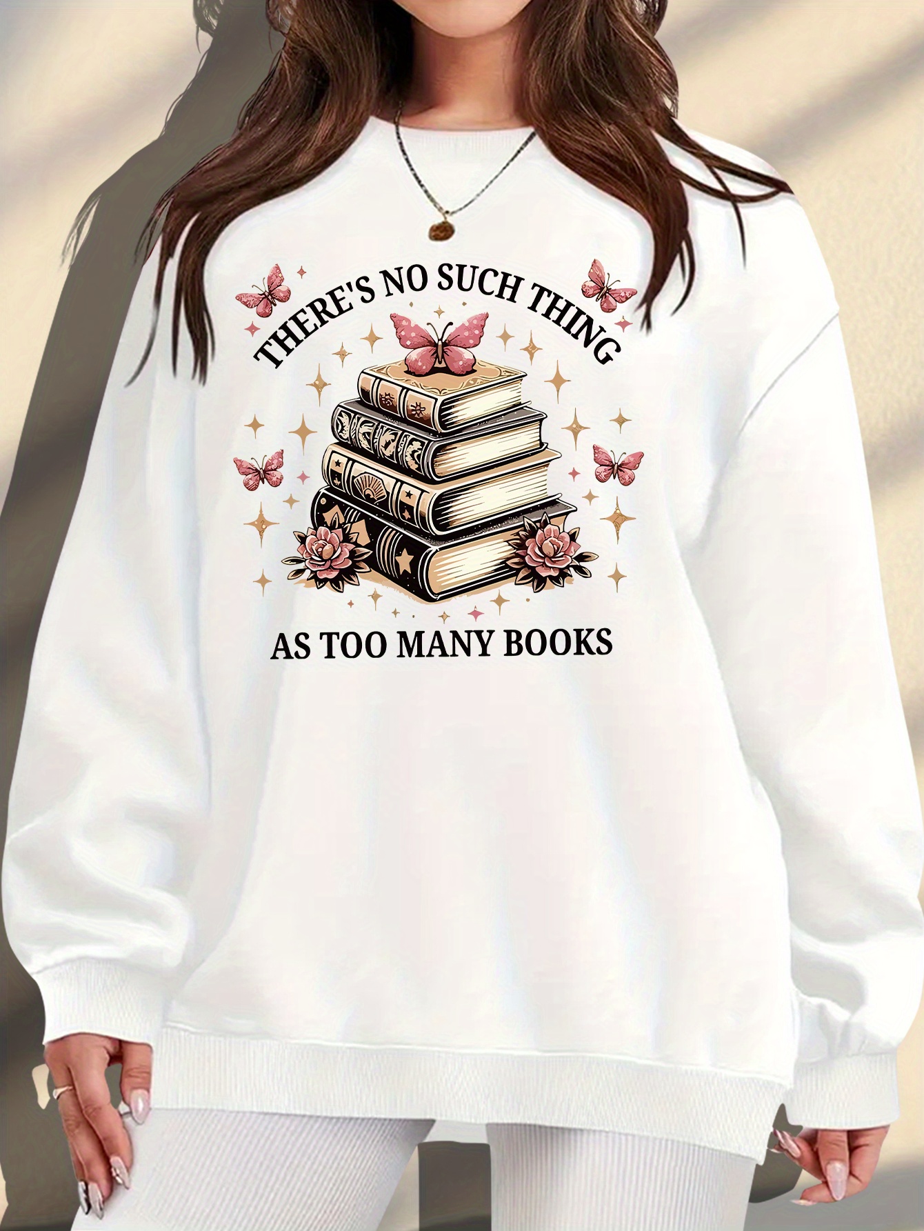 Women's Plus Size "There's No Such Thing As Too Many Books" Graphic Print Sweatshirt - Soft Peach Casual Pullover with Floral & Butterfly Design, Round Neck All-Season Comfort, Machine Washable